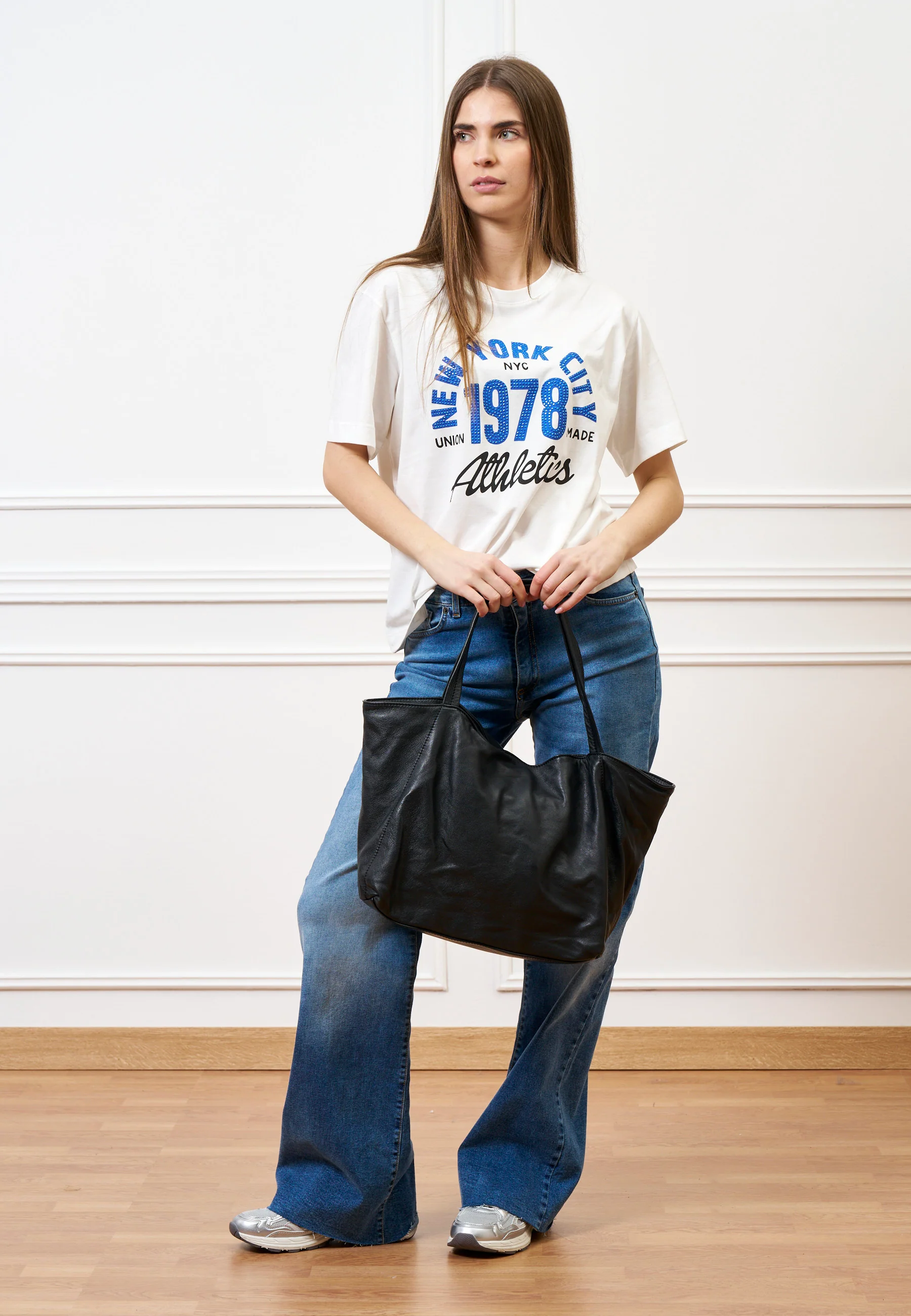 Questa maxi shopper in camoscio unisce funzionalità e carattere in un design essenziale, pensato per l’uso quotidiano.