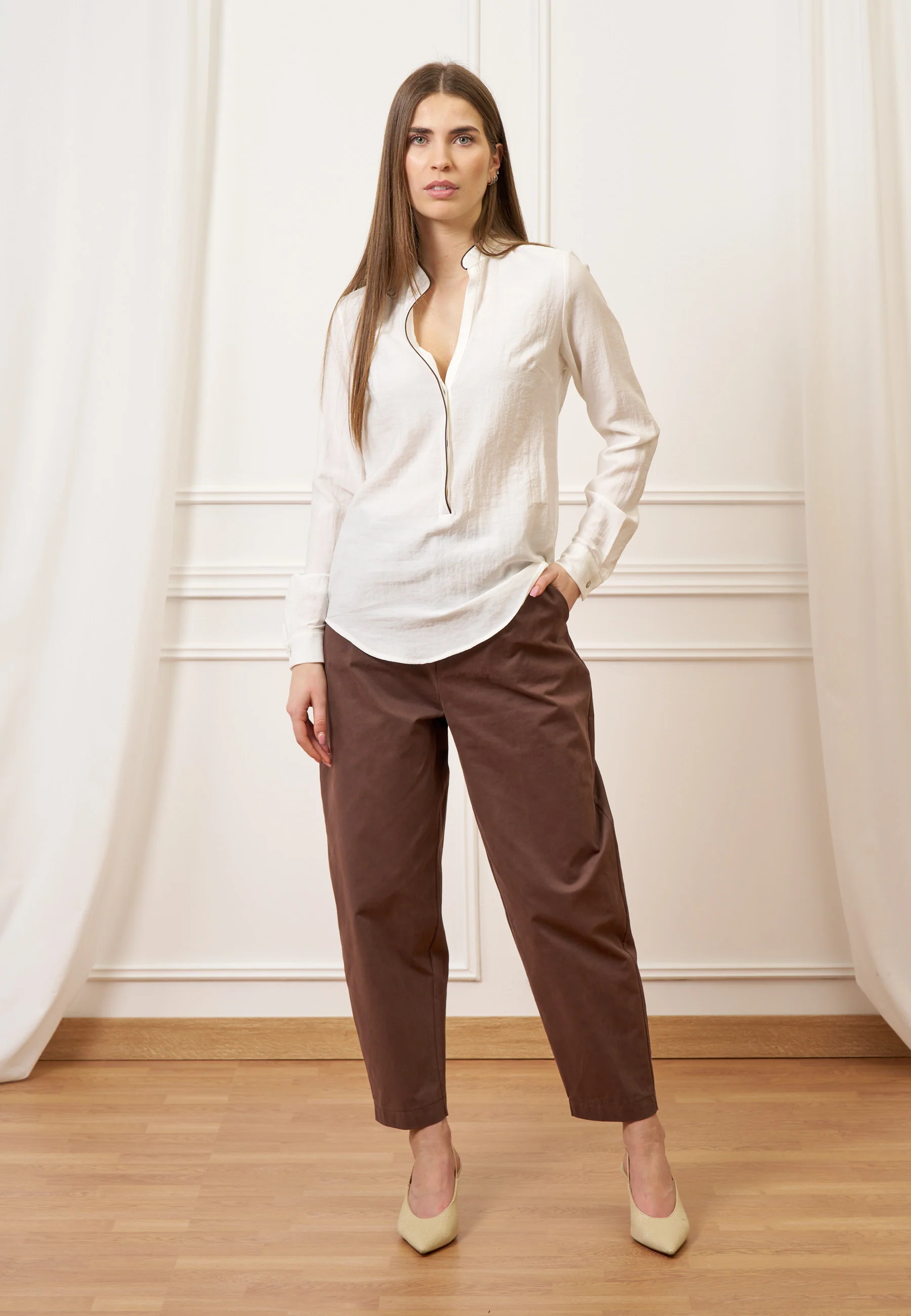 Camicia leggera e raffinata, caratterizzata da un tessuto leggermente stropicciato e da profili a contrasto.