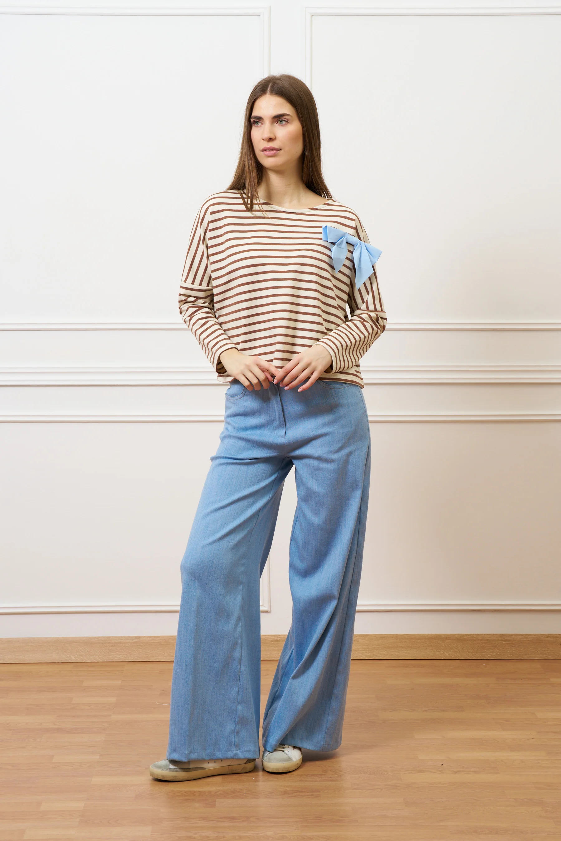 Felpa a righe dal taglio over valorizzata da un fiocco applicato che aggiunge un dettaglio femminile e distintivo.