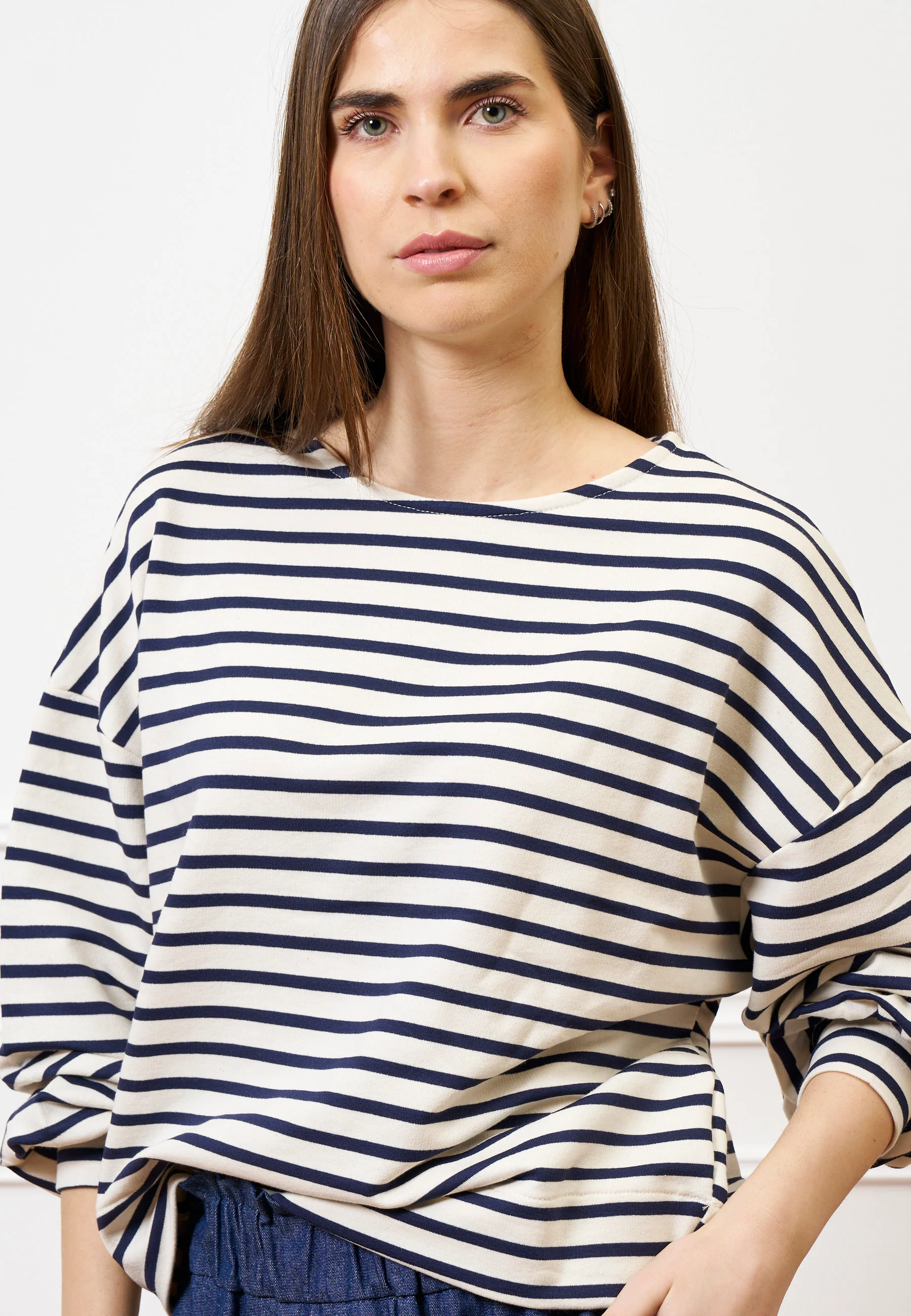 Grafica e contemporanea, la felpa a righe si distingue per le maniche voluminose che aggiungono movimento alla linea essenziale.