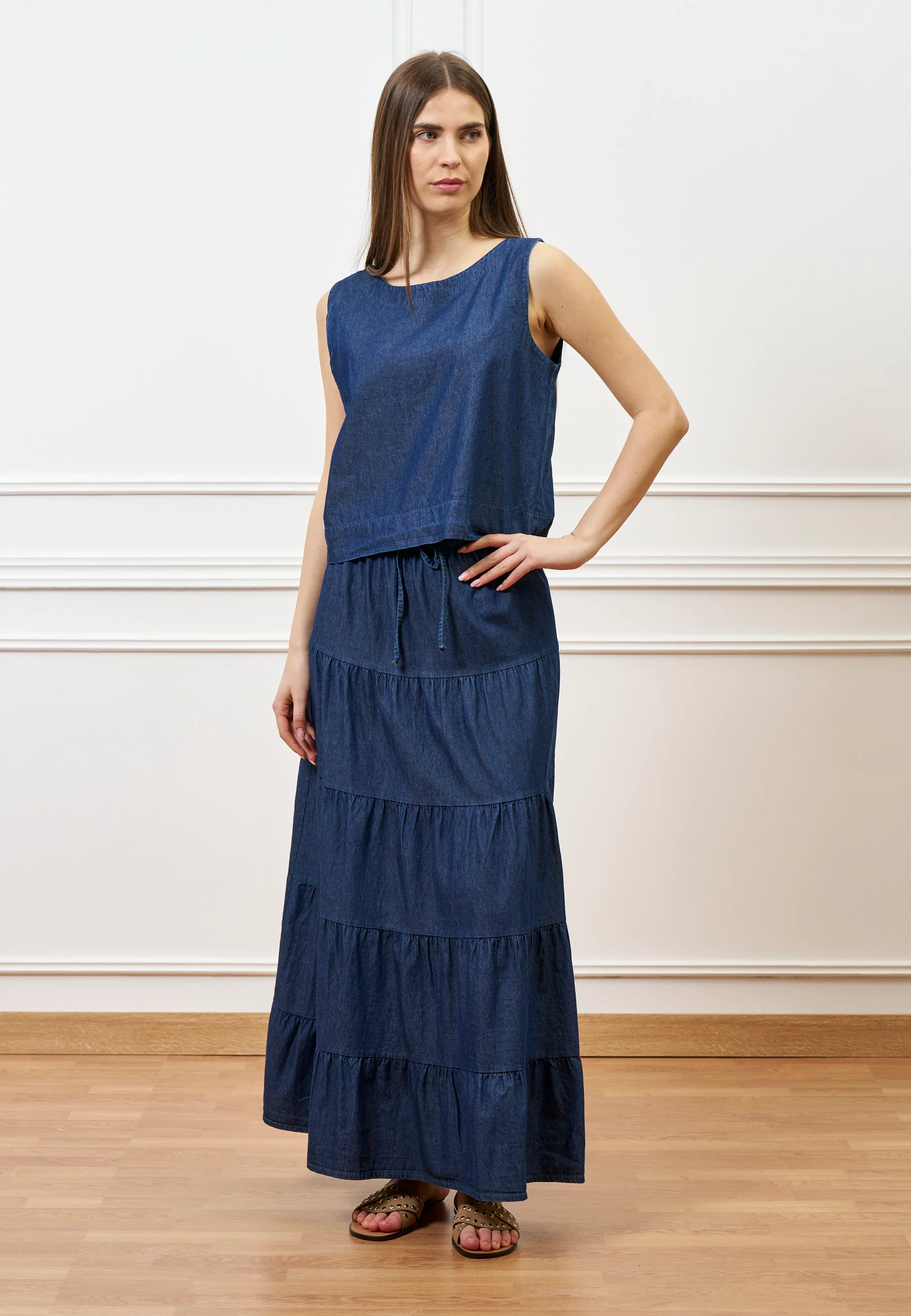 • Tessuto chambray in cotone, leggero e traspirante dall’aspetto denim