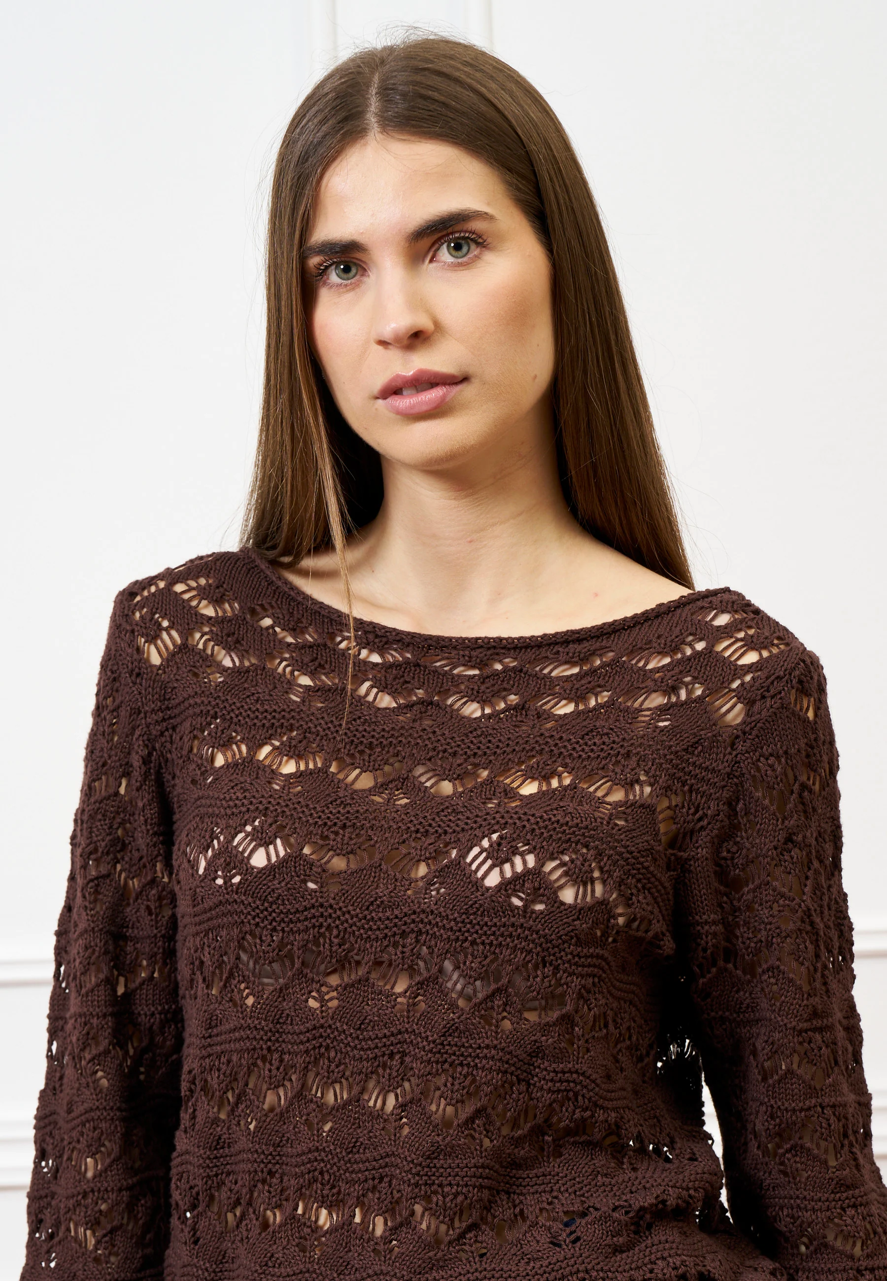 Linea morbida e volumi rilassati definiscono questa maglia traforata.