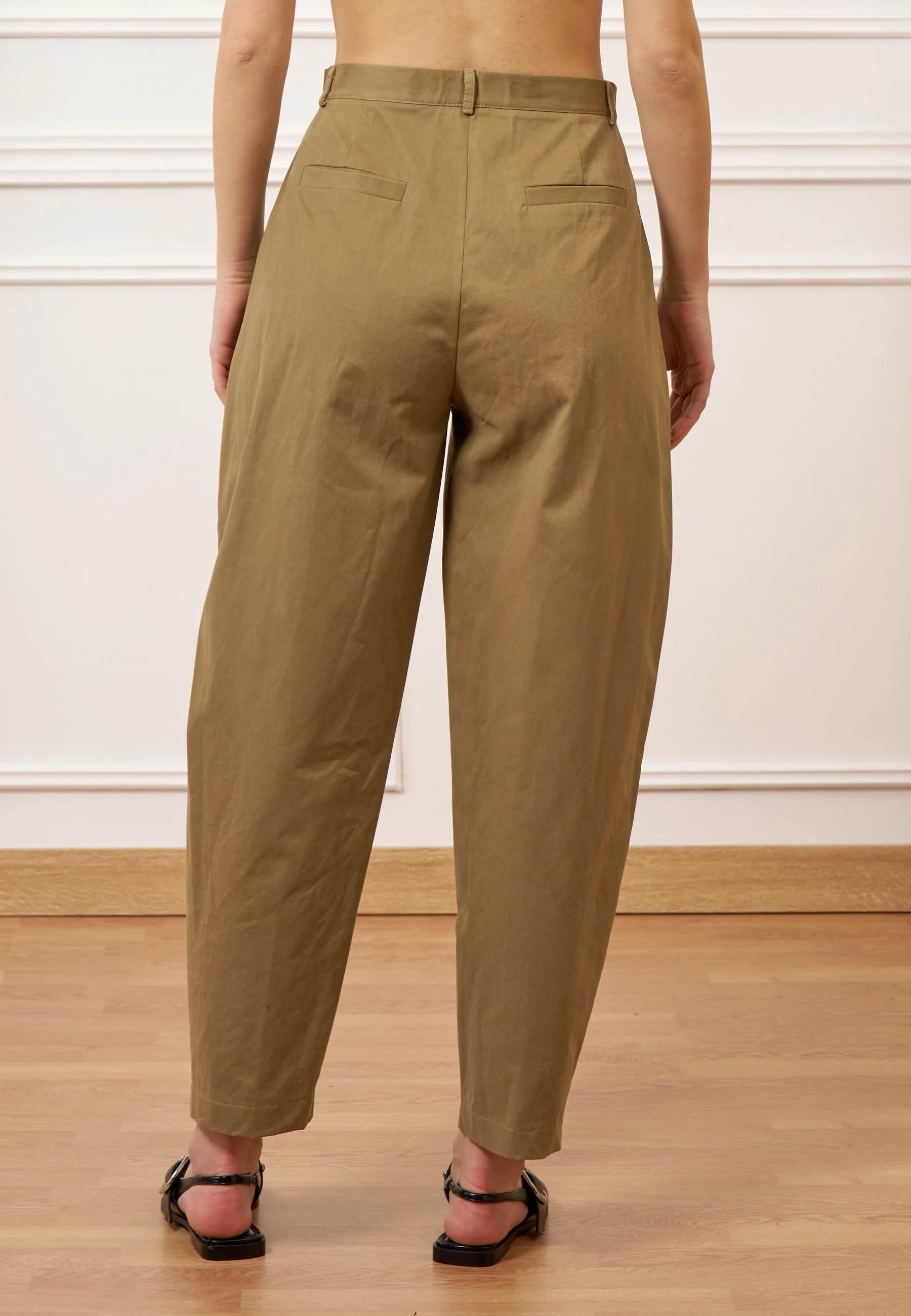 Linea balloon e vita alta definiscono un pantalone dal taglio morbido e moderno, valorizzato dalle pinces. Il tessuto in cotone garantisce comfort e libertà di movimento.