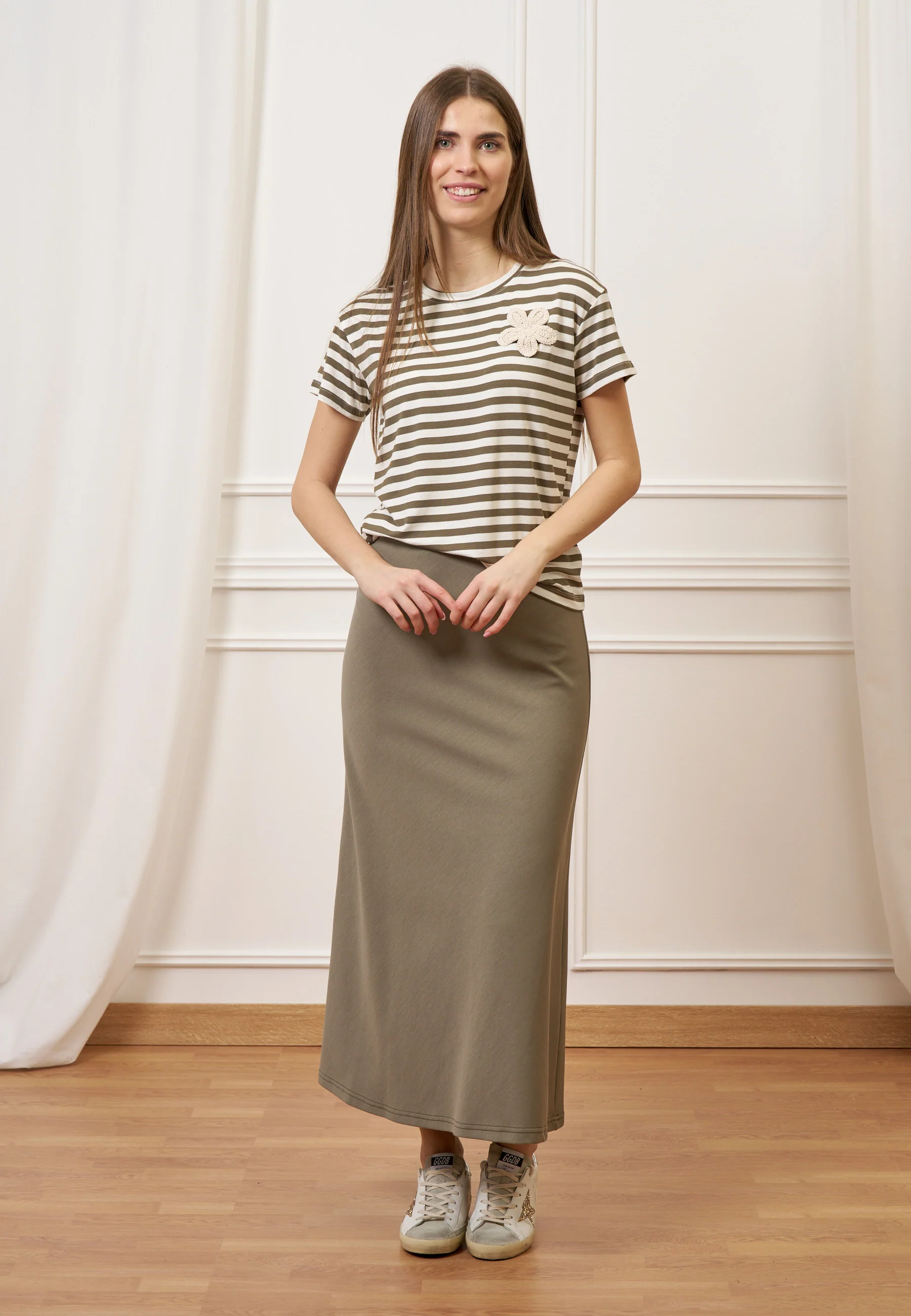T-shirt a righe con fiore crochet - MILITARE/LATTE